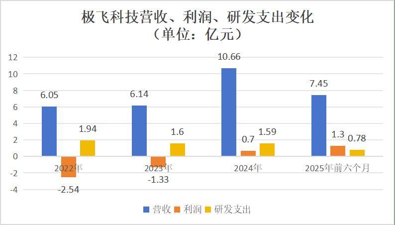 2022年、2023年,极飞科技的利润为-2.54亿元、-1.33亿元,2024年扭亏后利润为7041万元,2025年前六个月利润为1.3亿元。