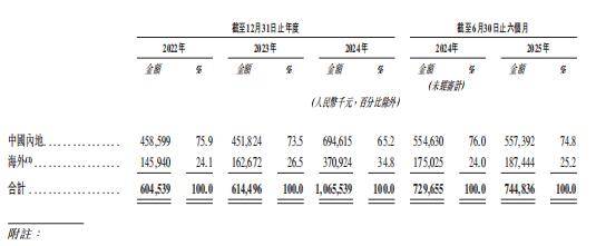 从海外里商场来看,极飞科技正在2022年至2025年前六个月来自中邦内地的收入永诀为4.59亿元、4.52亿元、6.95亿元及5.57亿元,占比永诀为75.9%、73.5%、65.2%和74.8%。