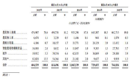 极飞科技的收入紧要开头于农业无人飞机、农业无人车、农机自驾仪、智能农场物联网产物及配件。个中,农业无人机的收入占了绝大部门,2022年至2025年前六个月,永诀为4.75亿元、4.99亿元、9.35亿元及6.63亿元,吞没总收入的78.6%、81.2%、87.8%、89%。